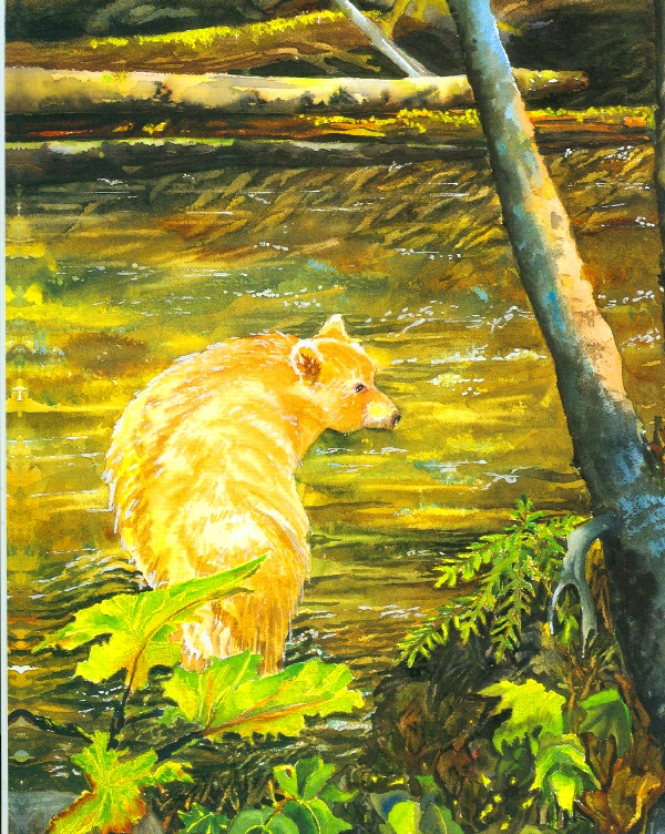 Experiencing the land, sea, creatures and culture of the Pacific Northwest Coast moves me still all these years later. Spending time in a functioning ecosystem moved me to tears then and moves me now. Something about being a non-essential component in the community of life liberates me. I belong to this earth as a member of life’s community. I am not in charge. As human humble I can never know enough to untangle the complexity. Here, standing in this humility, my senses tingle and expand – not just the typical senses like sight and smell but the unseen vibrational ones, too. Being tuned in to mystery, living aliveness, allowing myself to be awed, all that enriches my experience of being here now in a body. And seeing the spirit bear at home in its habitat amplifies my life. You know how they used to say, “Seeing is believing?” I appreciate that statement now. Seeing the white black bear elicits a response so enormous in me that words are limp descriptors. Poetic form helps:
