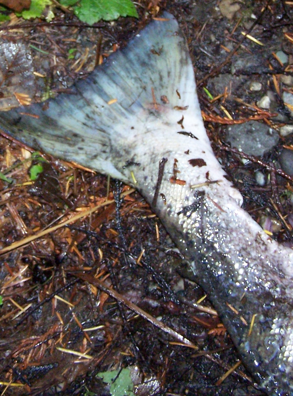 We study the adipose fin at length. Those fins are cut off hatchery fish. Though the tip is either bitten or rubbed off, this salmon appears to have the adipose fin intact. That’s why we surmise this is a wild Coho.