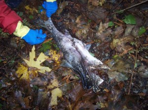 We find a dead one, today. A big deal actually since we haven’t seen any signs of fish in the creek. Eleanor, our team leader, has given me the clip board and pencil to record the facts. She’s ahead of me on the trail and comes running back to find me, her face alight with excitement. She’s stumbled on a headless body. Shimmering silver lies smack dab in the middle of the trail. As we investigate it, we realize we need our “kit.” Eleanor runs back to the car to get it. So convinced are we that we won’t see any salmon that we haven’t brought the tape measure, the knife, the plastic bags, or the most important item…the identifier…Six fish pictures are laminated on stiff cardstock, three on each side. We flip back and forth, thinking that surely this will be a Chum, since that is more common. After thorough scrutiny we are convinced we have a wild, female, adult Coho salmon in our hands, literally. What a miracle.
