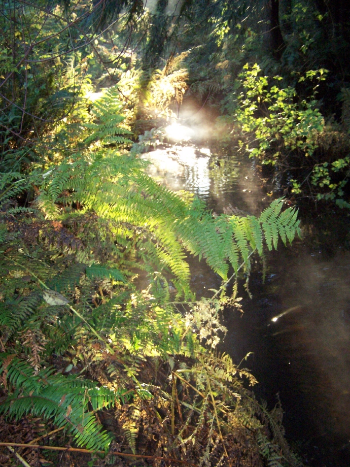 We’ve had rain in the past week. The stream bed flows with more water and a faster current. The surge may not last long, but today there are new tributaries overflowing the banks, shining waterfalls and sun shafts in mist since the water is warmer than the air.