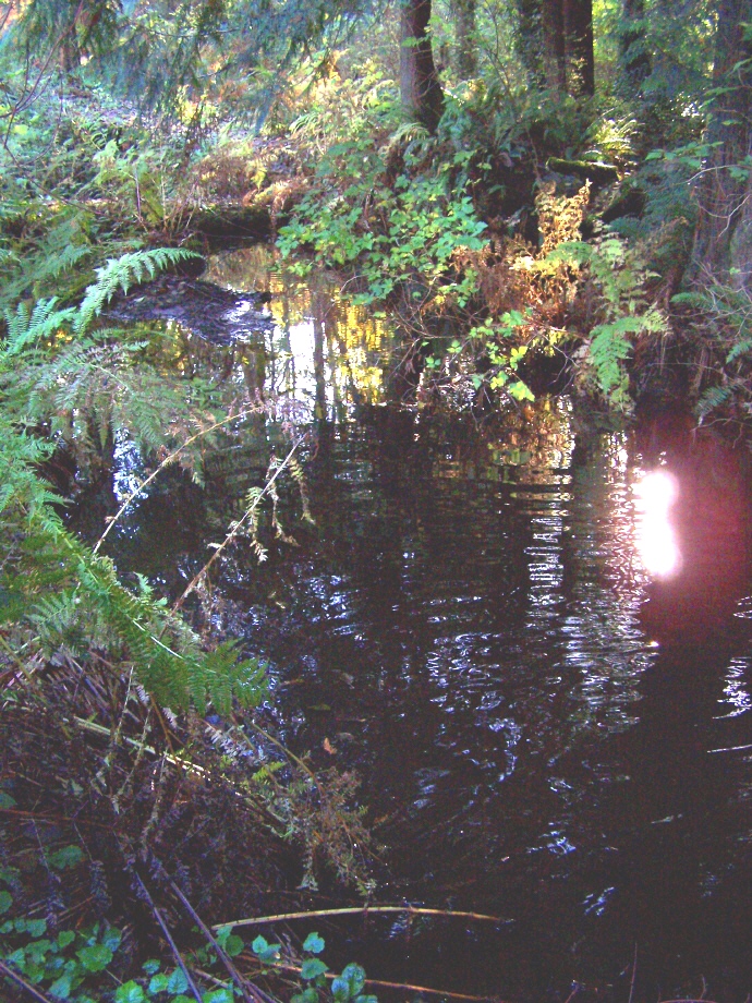 My mind meanders as I drive home fast on slick highways in the raining dark, bedazzled by rubies ahead of me and diamonds racing toward me on the other side of the median strip. This dazzling world of shifting forms reminds me of the salmon stream reflecting sunlight, shadow, the forms and colors above and below the surface of the water. Both environments mesmerize me.