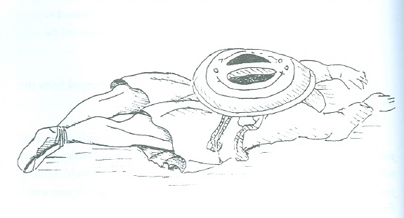 Lying on blankets, we stretch out on our stomachs in two rows with our heads toward each other’s. We cross our ankles and rest our hands, palms down, just above our heads which are turned to the right side. To replicate the drawing as closely as possible, we place our hand drums on our upper backs. My drumming will resonate with these drums like tuning forks, deepening our body/mind response and assisting the spirit horse which carries our consciousness into alternate reality. (In Shamanic terms, the drum is often considered to be a horse.)