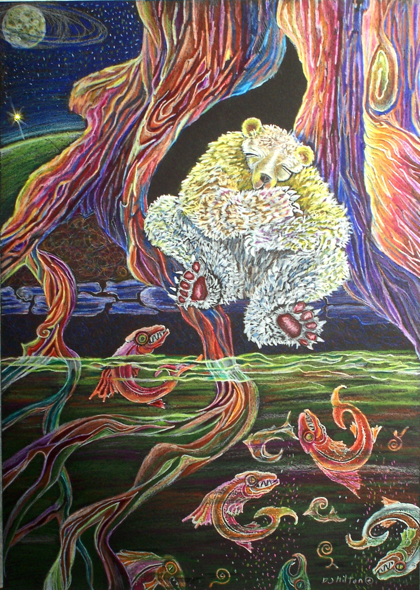 Hibernating bears teach me about the dark. I am blown away by the white forest bears who still live in BC and may have lived inNorthern Europe, if we can believe some of the old stories like Valomen. They can’t dig dens the way a grizzly can because their claws are too short. Dependent on the old growth trees which hollow out as they age, the white bears burrow into a tree for the long nights’ winter, the females, hopefully, pregnant and dreaming perhaps of new life coming, salmon eggs spawning, seeds gathering momentum for the great splitting open of Spring.