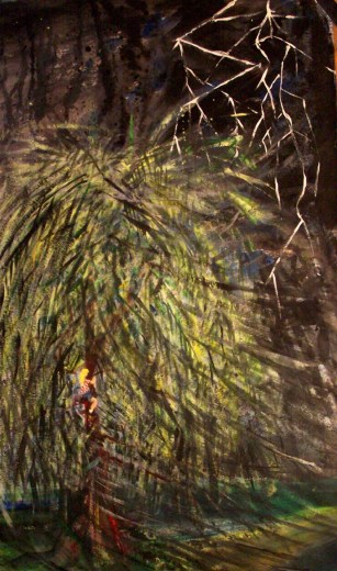 Yesterday, I began this painting to portray my memory as a ten year old of climbing the willow in my back yard to escape from my parents’ arguing. Thunder rumbled but I didn’t care. I had to get high into the arms of my beloved tree. I knew it was dangerous to be IN a tree, let alone near a tree, when it was lightning. But I didn’t care. I also felt safer there than in the house.
