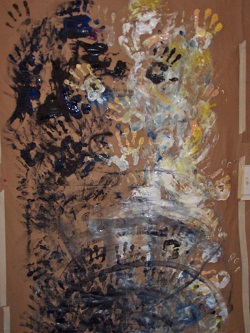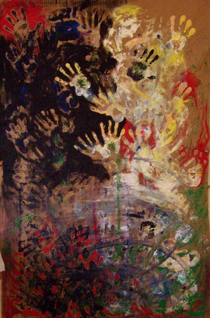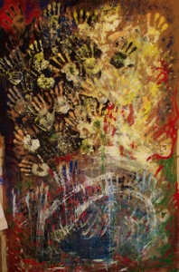Finger painting becomes hand painting. Suddenly I feel my “handcestors” coursing through me and anger surges up for all the generations of alienation from my primal and indigenous origins. I begin slapping my hands on the wall and at one point I press my two hands really hard into the wall with all my might, loving how the wall resists and actively seems to push back at me. Tears pour. I’m in the grip of huge anguish and yet there is room for rational thought and the thought is this:  I wish someone were photographing this! I know my posture totally illustrates the pain, agony and anger of being separated from my primal ground since being born into this modern/urban/suburban/civilized/cultured and sterilized life.