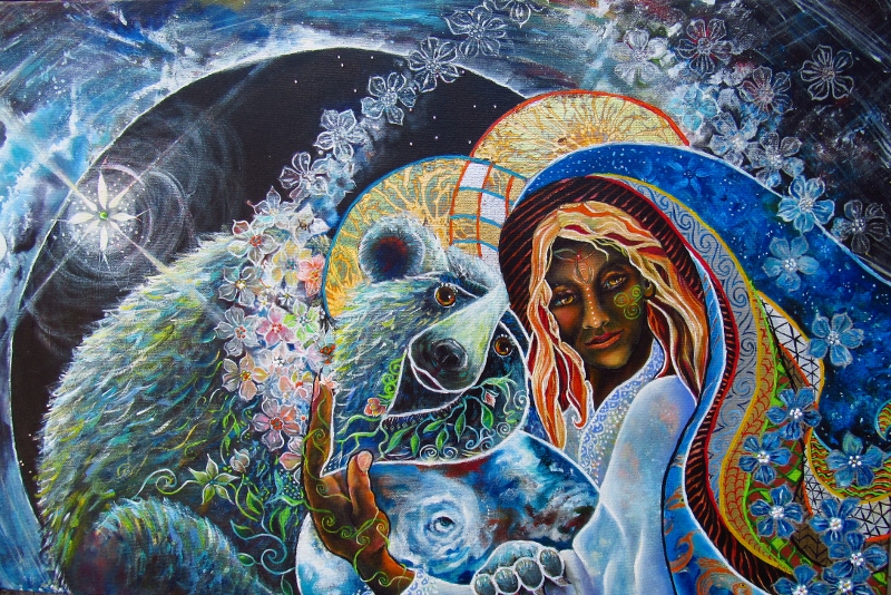 My babies, my babies… Mother dog and her son barking and barking. I watch safe behind glass as mother bear slowly proceeds down the driveway. No gun, thank god, but if only I had a gun, thank god I don’t, who would I be if I did, but if only…what to do what to do. Fragile wire fence my kids’ only protection. Mother bear closer – baby bear still watching from where s/he’s been told to stay. I surrender. I have to do something. I get a metal pot and a wooden spoon and open the door, step out onto the porch. Not sure I want to add to the racket as I watch the mother bear advance. Trust. I want to trust. I want to witness the unfolding of life before my eyes, I want to spread love and peace and compassion and justice and harmony and plenty of food for all and shelter and safety and all the things we’ve ever dreamt about for our babies, my babies, his babies, her babies.
